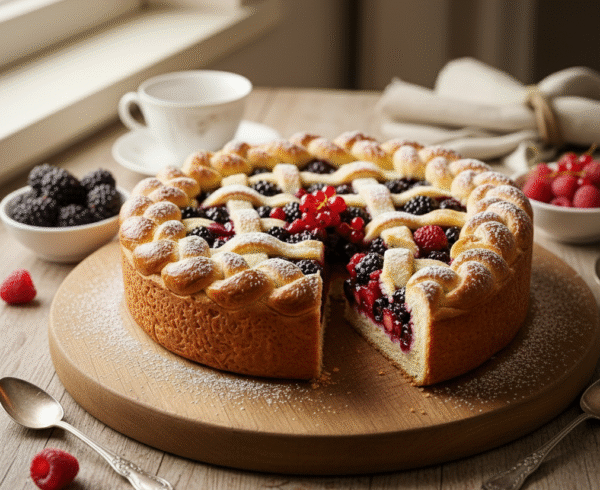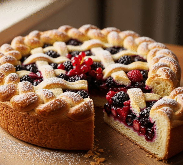 1. Пирог "Ягодное Плетение" сочетает в себе воздушную французскую бриошь и сочную ягодную начинку, создавая идеальное гармоничное сочетание. Золотистая, сдобная основа, сплетенная в изящный узор, обнимает россыпь свежих лесных ягод – ежевики, малины, смородины – щедро присыпанных сахарной пудрой. Каждый кусочек этого пирога – это настоящее удовольствие, тающее во рту, которое прекрасно подойдёт для праздничного стола или уютного чаепития.