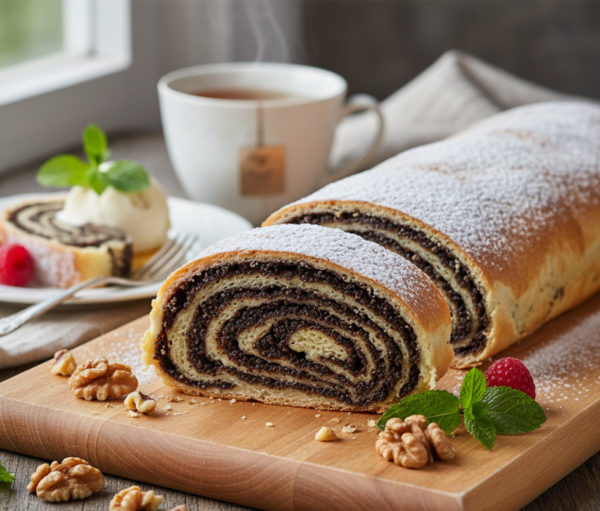 6. Штрудель с маком и грецкими орехами готов. По истечении времени достать готовый штрудель с маком и грецкими орехами , охладить, нарезать и подать.