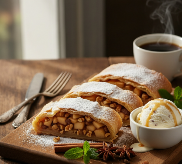 7. Готовый штрудель с яблоком и грецкими орехами охладить, украсить по вкусу, нарезать и подать.