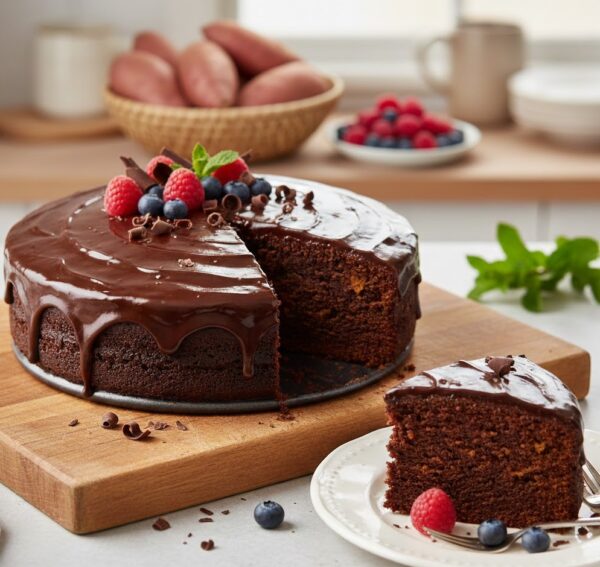 - Шоколадный торт с бататом — настоящий мастер маскировки. Никто из гостей не догадается, что за невероятно влажной, бархатистой текстурой и насыщенным цветом скрывается сладкий картофель. Это десерт для тех, кто ценит индивидуальность и любит удивлять.