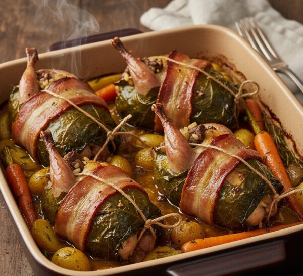 - Выложить перепелов в форму и запекать в духовке, разогретой до 180°C, в течение 35–40 минут, пока бекон не станет золотистым и хрустящим.