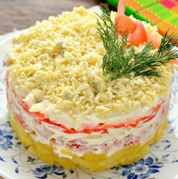 - Пятым слоем выложить белки яичные, майонез и заключительный слой желтки яичные, которые сделают салат ещё и красивым. Дать немного настояться.