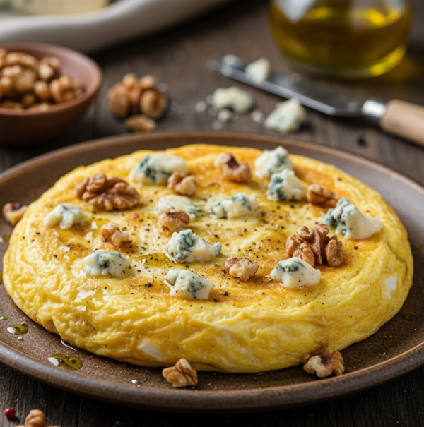 1. Творожно-яичный омлет с голубым сыром и орехами — блюдо для настоящих гурманов! Пикантная, острая нотка голубого сыра в сочетании с нежной творожной основой и хрустящими грецкими орехами создаёт уникальный и незабываемый вкус, который преобразит ваше утро.