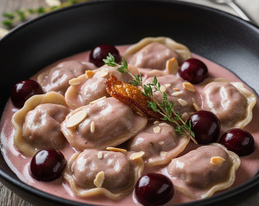 Пельмени с уткой в сливочно-вишневом соусе