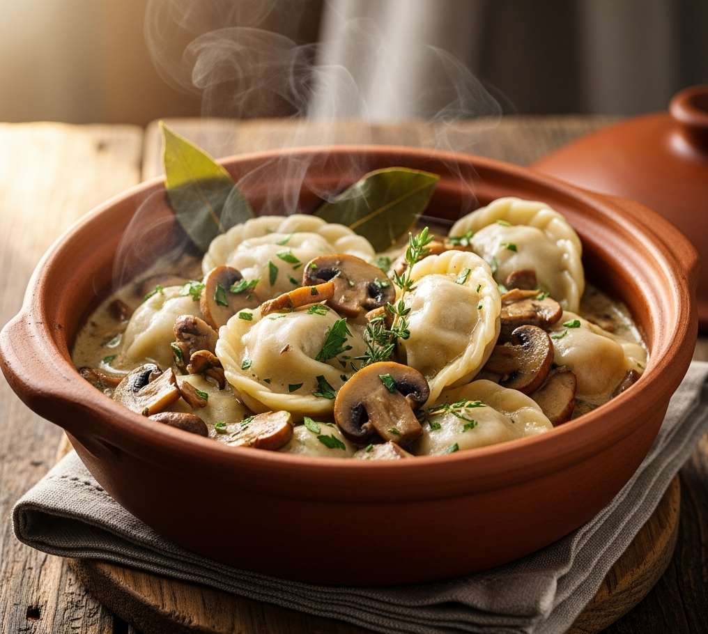 Пельмени в горшочке, с грибами