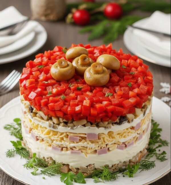 - Попробуйте салат "Рубиновый Слой"! Это идеальный слоеный салат с мясом и грибами, где каждый слой пропитан майонезом для максимальной сочности. Завершающий штрих — яркий красный перец сверху и целые маринованные шампиньоны для декора. Приготовьте этот вкусный и сытный салат, чтобы удивить гостей!