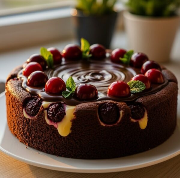 - Выпекать 35-40 минут. Вынуть, охладить и украсить шоколадной глазурью и фруктами.