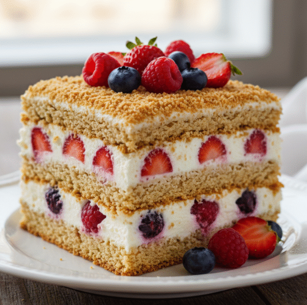 - Далее чередовать крошку, крем, ягоды и завершить торт крошкой. Украсить ягодами. Отправить торт в холодильник на 2-3 часа для пропитки.