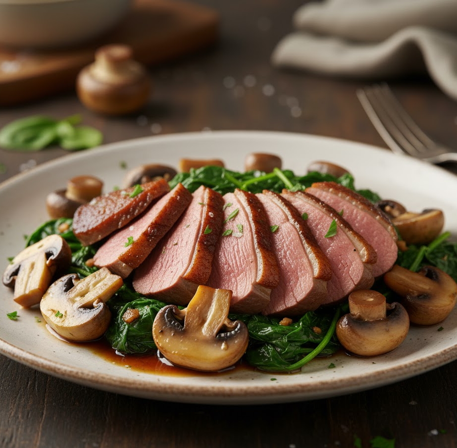 Утиное мясо с грибами и шпинатом